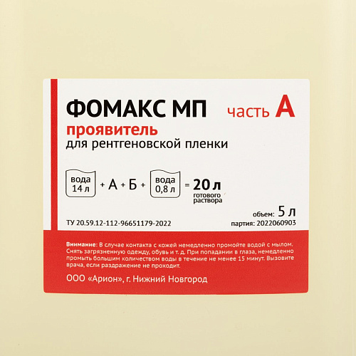 Фиксаж ФОМАКС предназначен для обработки радиографических технических плёнок в автоматических проявочных машинах (фиксаж ФОМАКС МФ) и в баках для ручного процесса проявки (фиксаж ФОМАКС РФ).